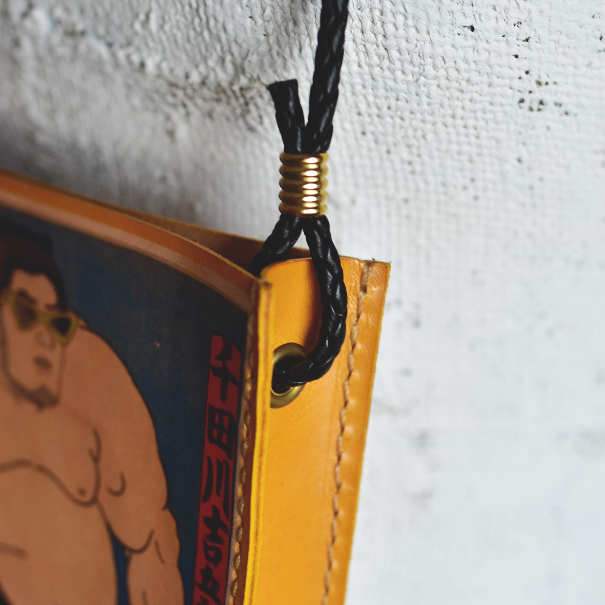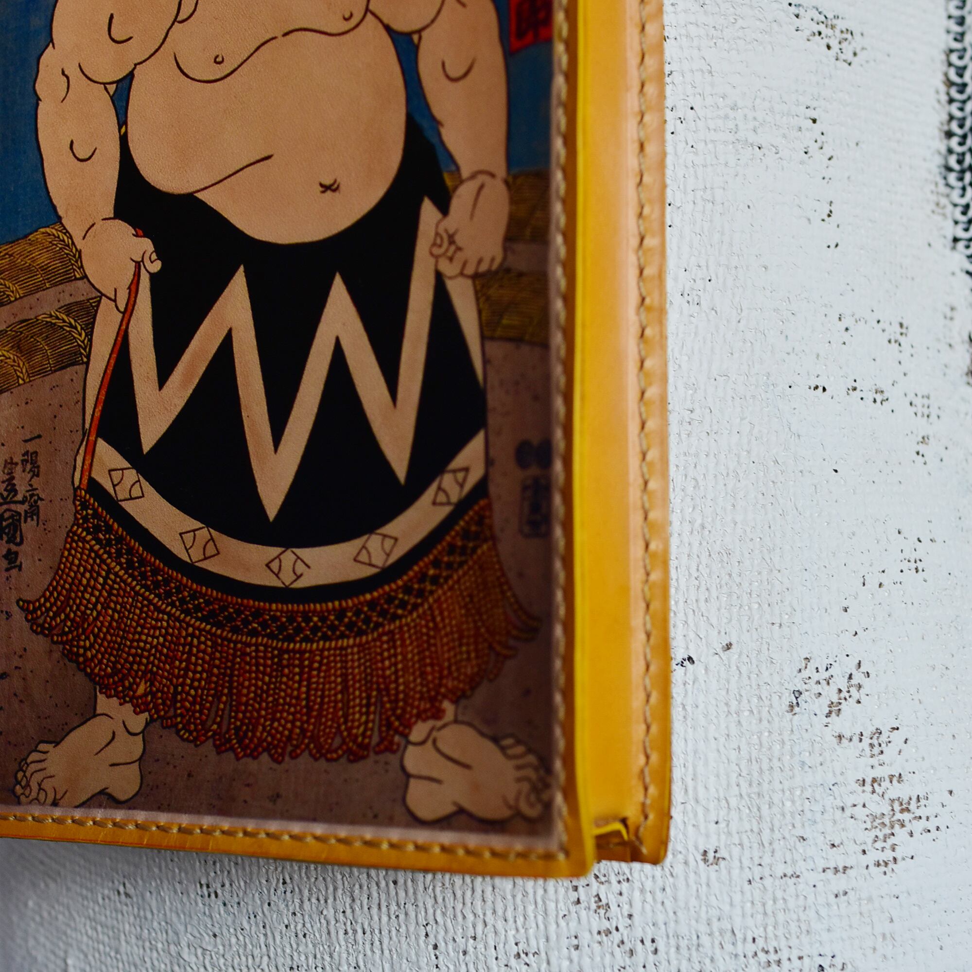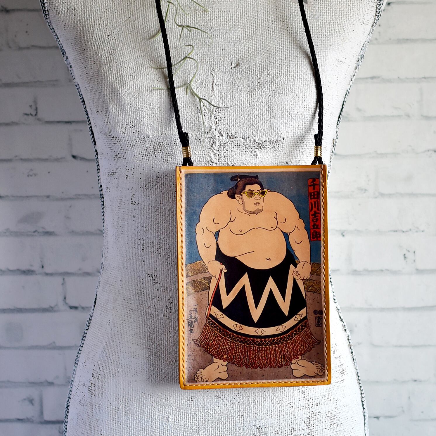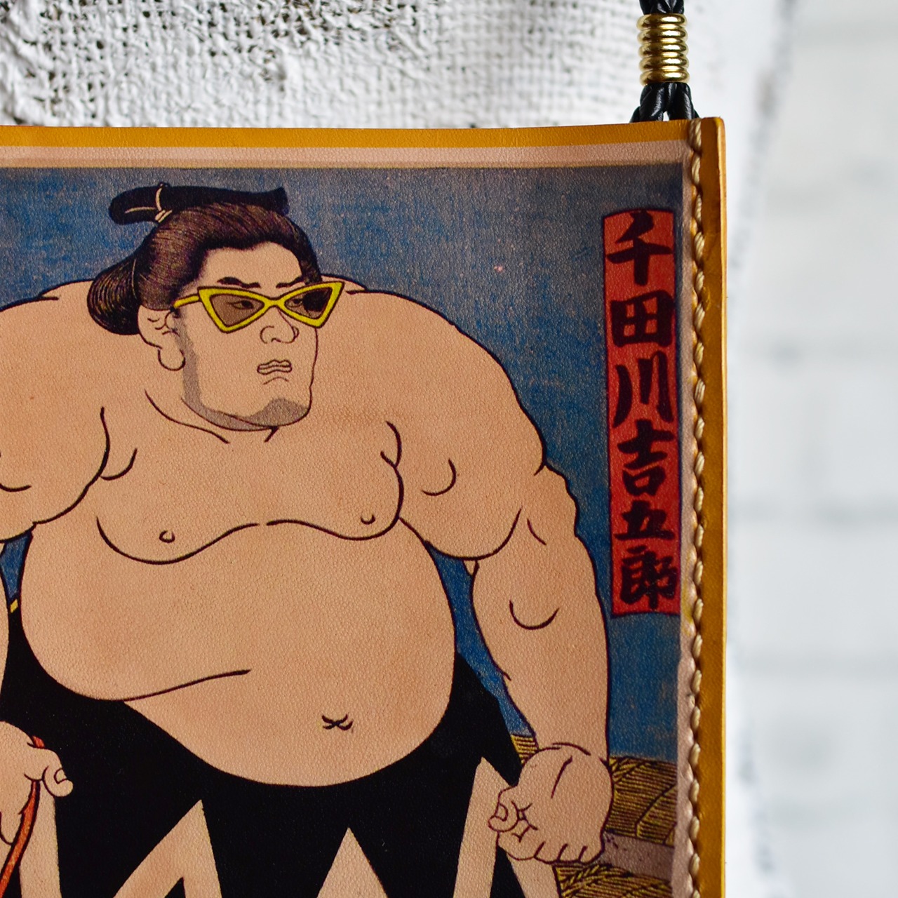 江戸時代の浮世絵の力士にサングラスをかけさせて革へ大胆にプリント。コンパクトながら存在感抜群のサコッシュです。