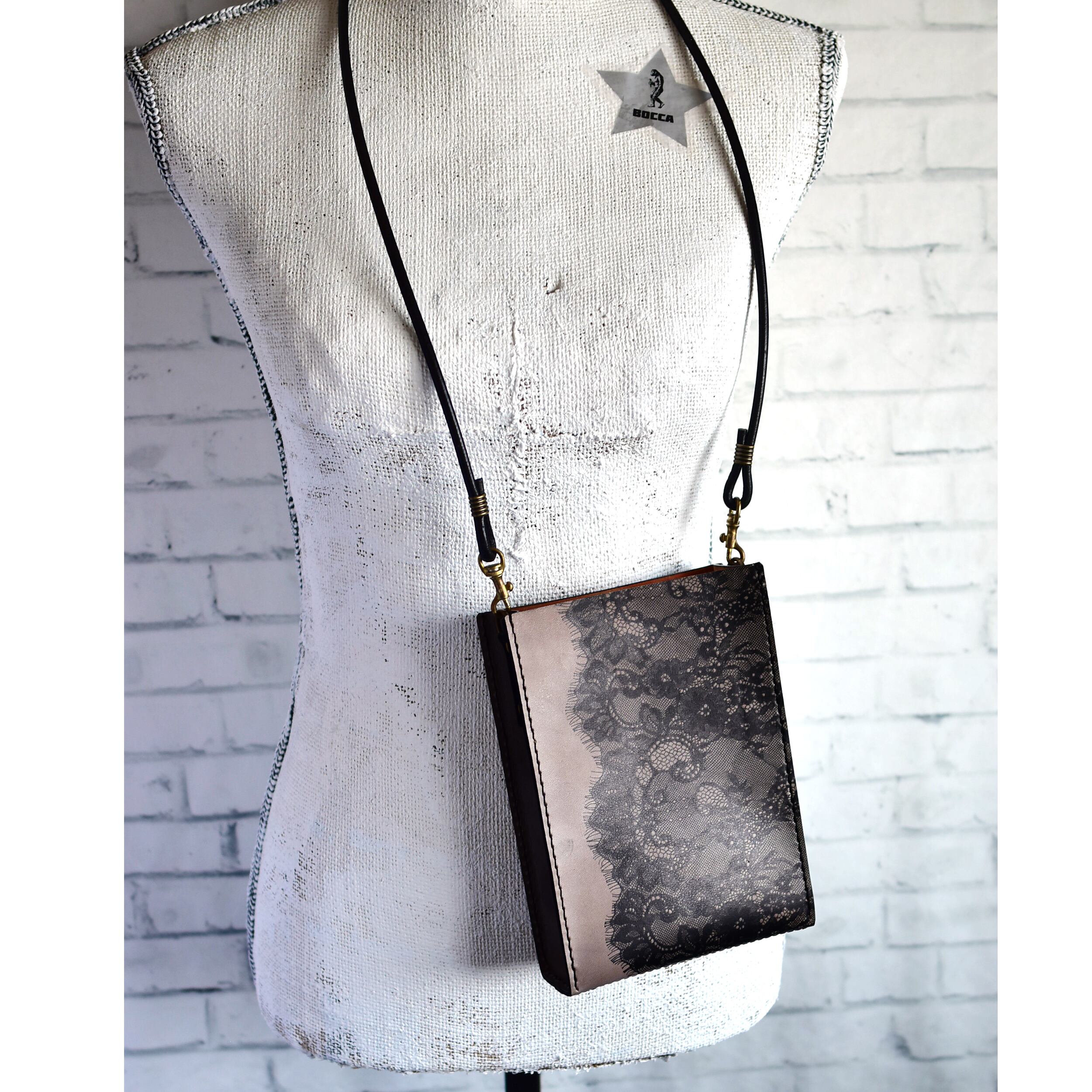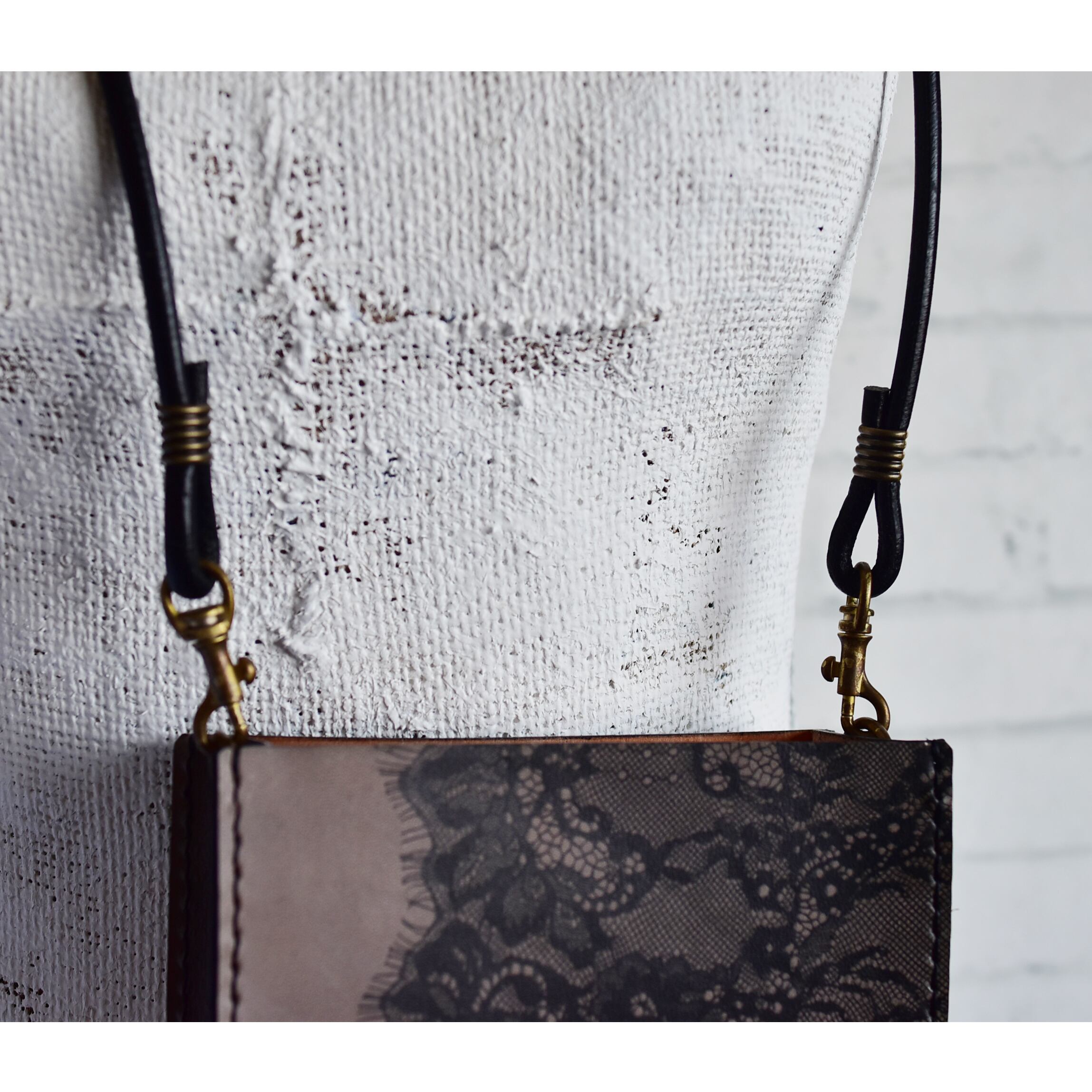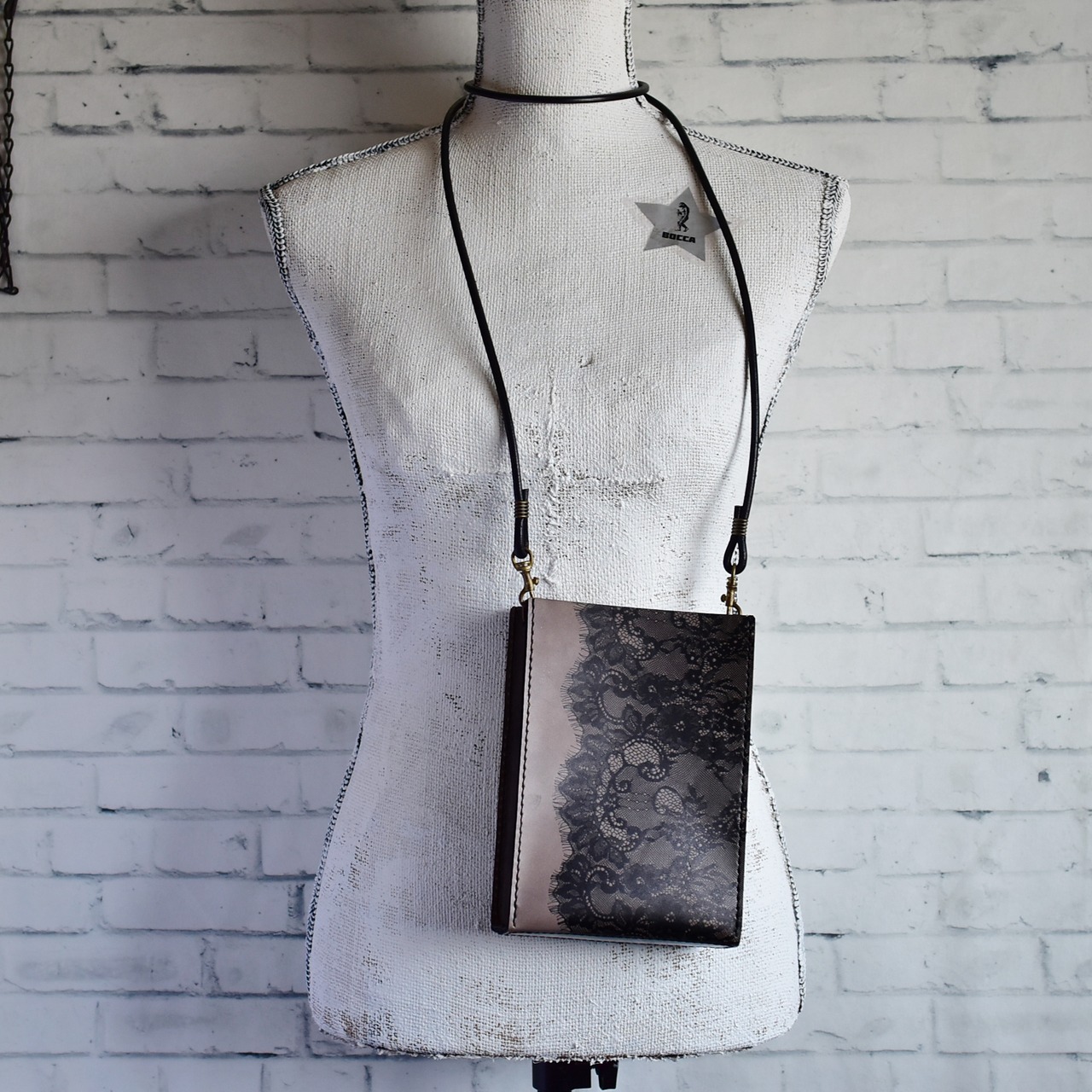 繊細なレースを革にプリントした仕立てのサコッシュです。