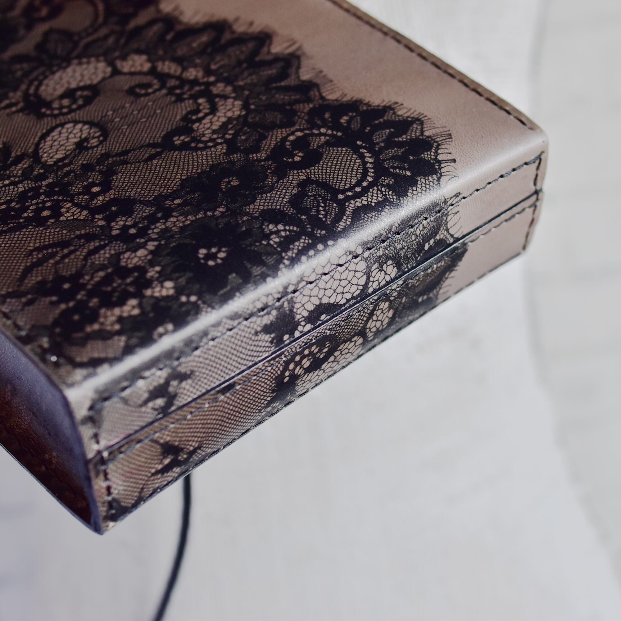 革の質感とレースの柄がかさなりあい、上品でありながら少しアンティークな雰囲気も漂うデザイン。